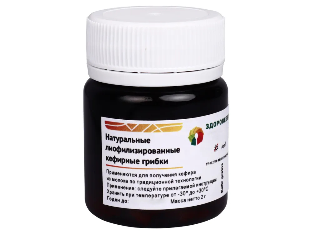 Состав: Натуральные лиофилизированные кефирные грибки торговой марки «Здоровеево» - натуральная симбиотическая культура дрожжей, молочнокислых и уксуснокислых бактерий